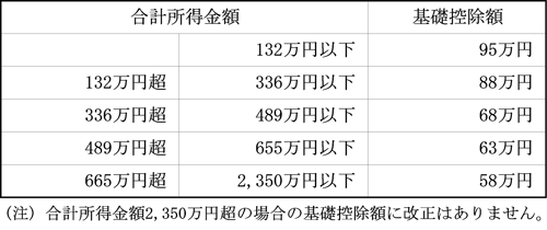 改正前は、2,400万円以下の合計所得金額に対し基礎控除の額は一律48万円でしたが、令和7年・8年分については、所得の金額に応じて次のように改正になりました。なお、令和9年分以降は、所得金額132万円以下は95万円、所得金額132万円超は58万円になります。