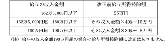 給与の収入金額190万円以下の人の給与所得控除の金額が、改正前は下表のとおり最低保障額が55万円でしたが、改正後は一律65万円に引き上げられました。