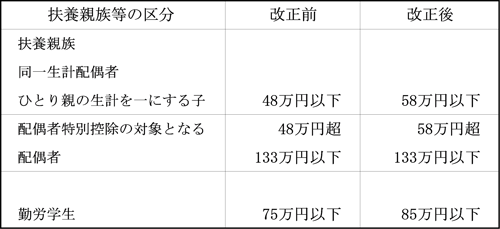 扶養親族等の対象となる扶養親族等の所得要件が下表のように改正されました。